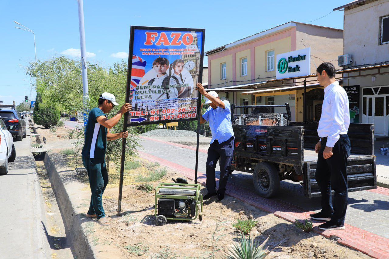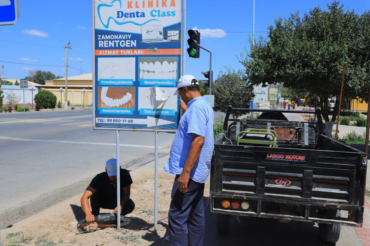 Joriy yilning 30-iyul kuni O‘zbekiston Respublikasi “Reklama to‘g‘risida”gi va “Davlat tili to‘g‘risida”gi qonunlari, Xorazm viloyati hokimining 2025-yil 3-martdagi 01-09/2122-sonli xati, xalq deputatlari viloyat Kengashining 2025-yil 26-martdagi VII-7-50-12-0-K/25 sonli qarori hamda sohaga oid boshqa qonun hujjatlarining ijrosi yuzasidan viloyat hokimligi Tashqi reklamalarni muvofiqlashtirish bo‘limi mas’ul xodimi I.Matchanov, Oʻzbekiston Respublikasi Raqobatni rivojlantirish va Iste’molchilar huquqlarini himoya qilish qo‘mitasi Xorazm viloyati hududiy boshqarmasi xodimi A.Mavlonov hamda Yangiariq tumani hokimligi tomonidan tuzilgan ishchi guruh vakillari tomonidan tumanning Urganch mahallasi Urganch ko‘chasidagi tashqi yozuv va reklama vositalarini o‘rganish ishlari olib borildi. O‘rganish jarayonida qonun hujjatlariga zid ravishda o‘rnatilgan reklama va tashqi yozuvlar ishchi guruh tomonidan bartaraf qilindi hamda mas’ul tadbirkorlik subyektlariga ogohlantirish berildi. O‘rganish ishlari davom etmoqda.
